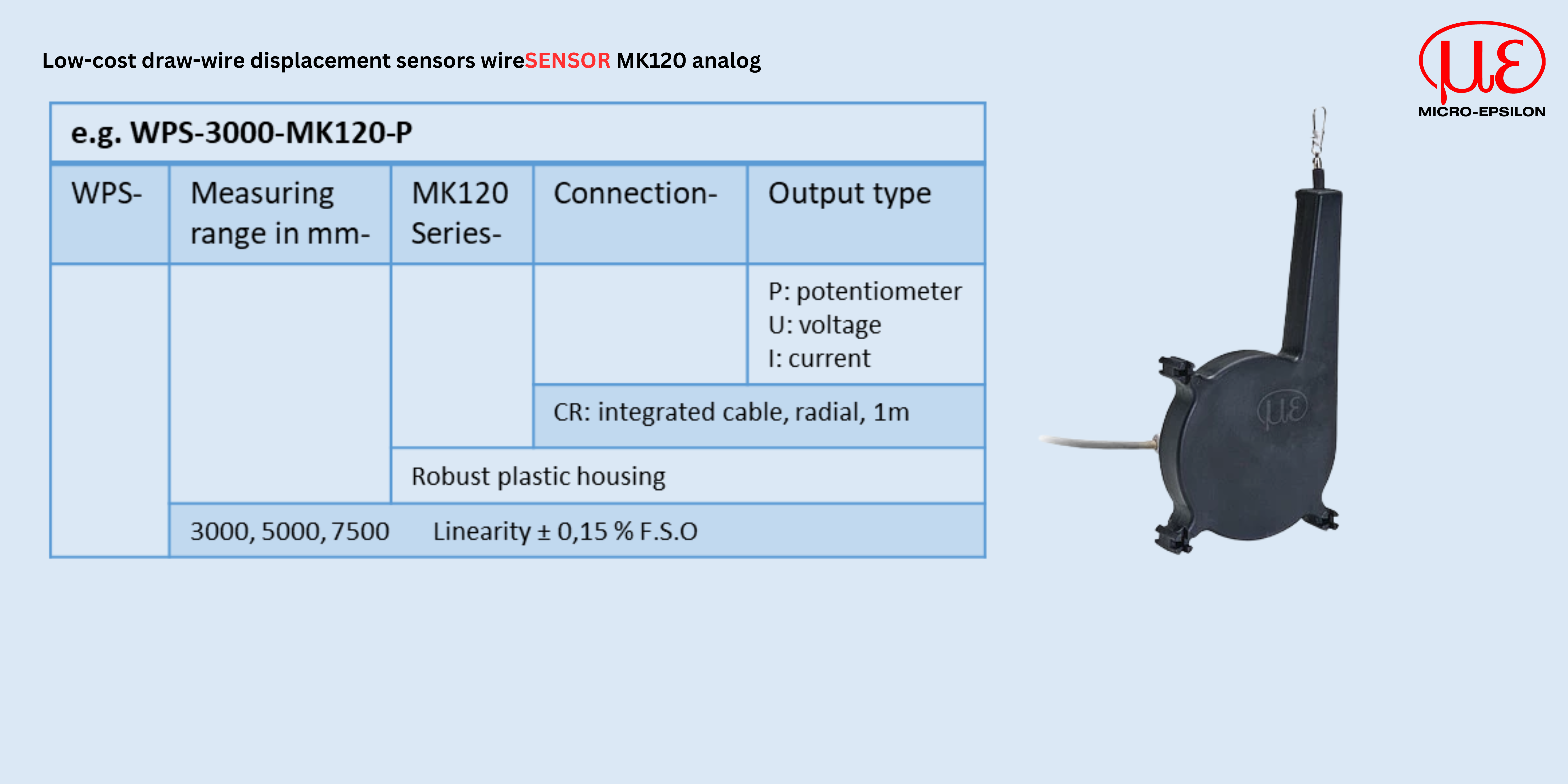 The miniature draw-wire sensors of the MK series are specially designed for use in high-volume production. Due to the favorable price and the compact size of the sensor, new potential designs and cost optimization are the benefits to the user.