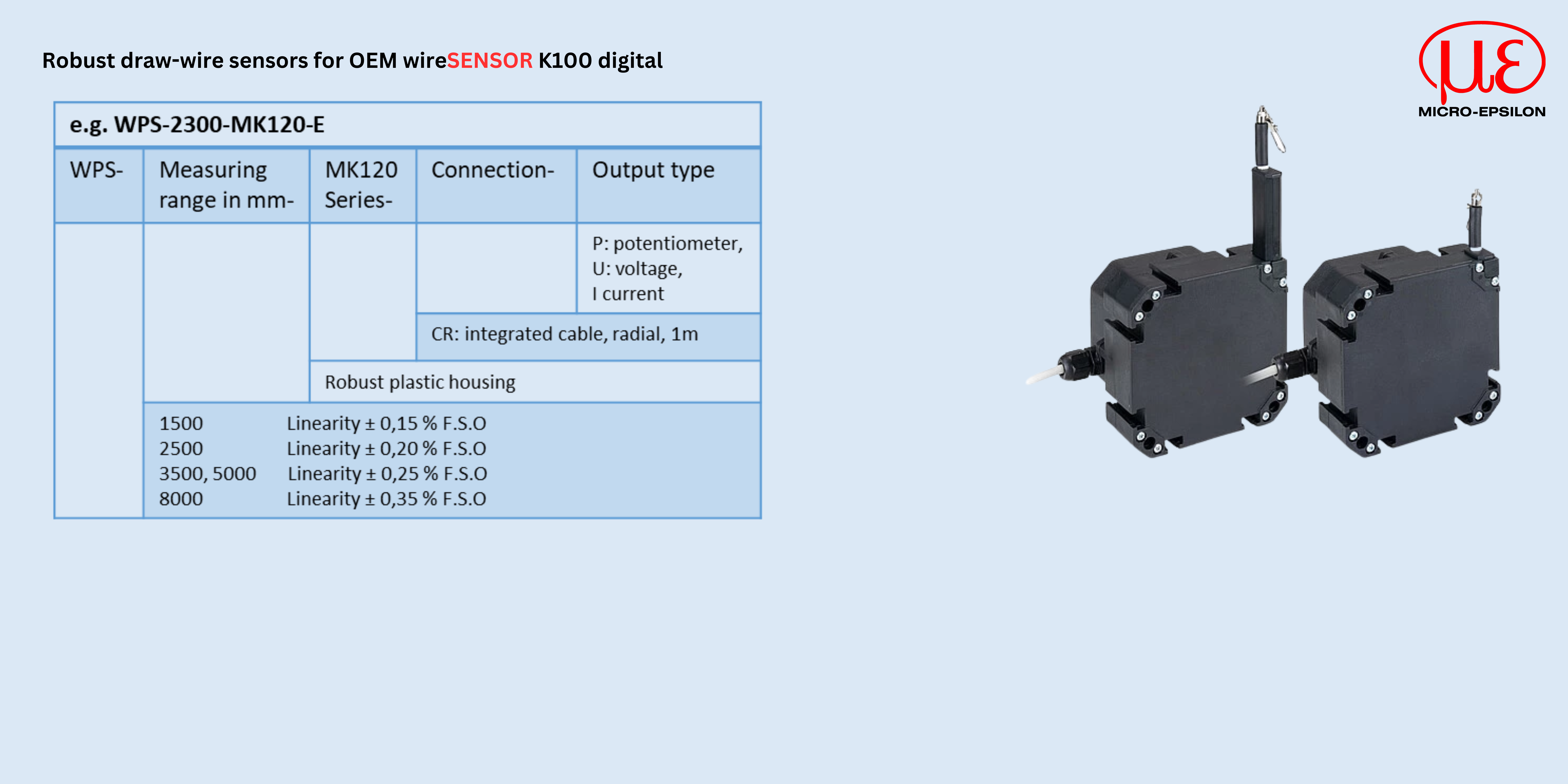 The K100 is specially designed for series use in mobile machines such as telescopic loaders or truck cranes. Its compact and robust housing (IP67/IP69K) made from glass-fiber reinforced plastic and its durable sensor design with separate drum and spring spaces offer increased protection against environmental influences. Specially in outdoor use, these sensors can be optimally adapted to the respective application.