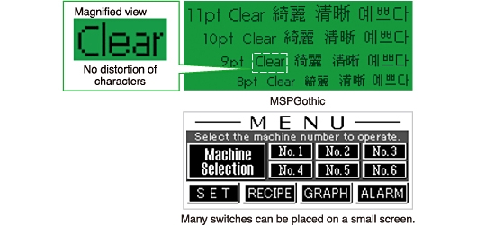 TextsSmall characters are displayed clearly with 200 x 80 pixel resolution allowing for flexible screen editing regardless of character size.