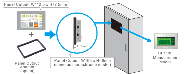 Small-sized HMI, but no compromise on visibility or operabilityWith a resolution of 480 x 272 pixels, information is finely displayed dispite the limitations of space. The 65,536-color display provides improved visibility and avoids incorrect operation caused by low display quality of monochrome models.