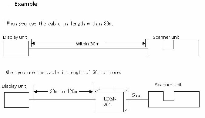 The standard length of the attached cable between the scanning unit and the display unit is 5m. A longer cable, available as an option, extends the cable length to 30m. A signal extender is used when extending a cable to over 30 metres, and can extend a cable's length to a maximum length of about 120m. No AC power supply is needed as the signal extender draws power from the display unit. |