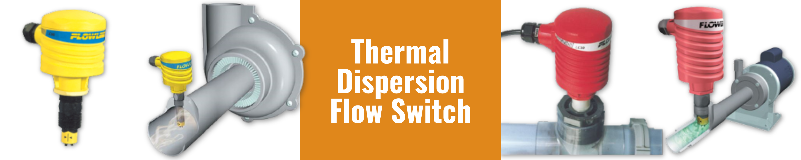 The thermal dispersion flow switches measure liquid or gas temperature to determine changes in flow velocity. As fluid flows across the sensing tips, the temperature is reduced proportionately as a function of the flow rate. When a temperature or velocity shift reaches the user defined set point, the switch changes state indicating the appropriate flow condition (flow of no‐flow).