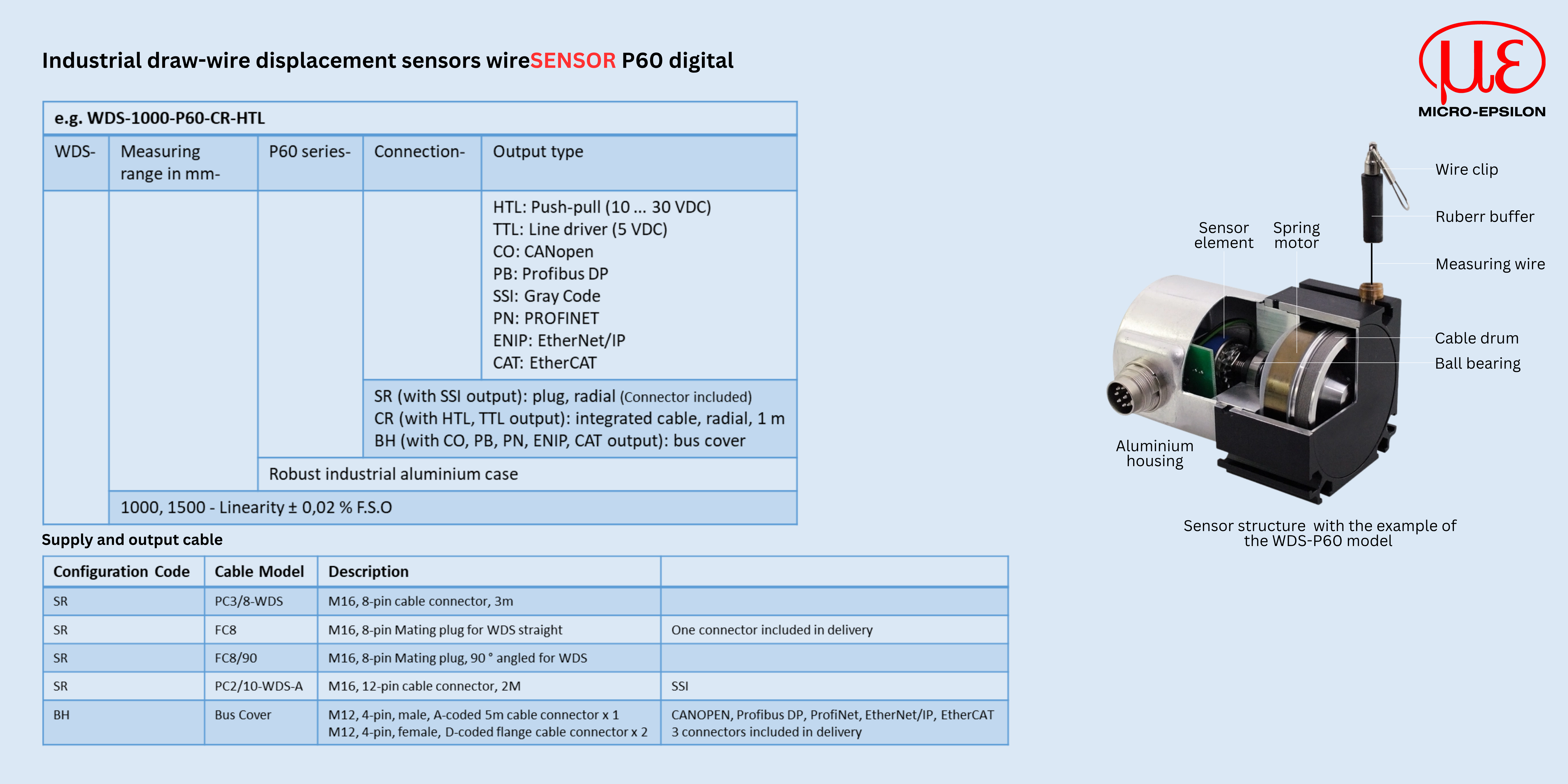 Draw wire sensors of the P60 Series are designed for general use. Numerous options enable a suitable sensor to be selected for almost any application. Various measuring ranges and digital output types facilitate fast integration for many application areas.