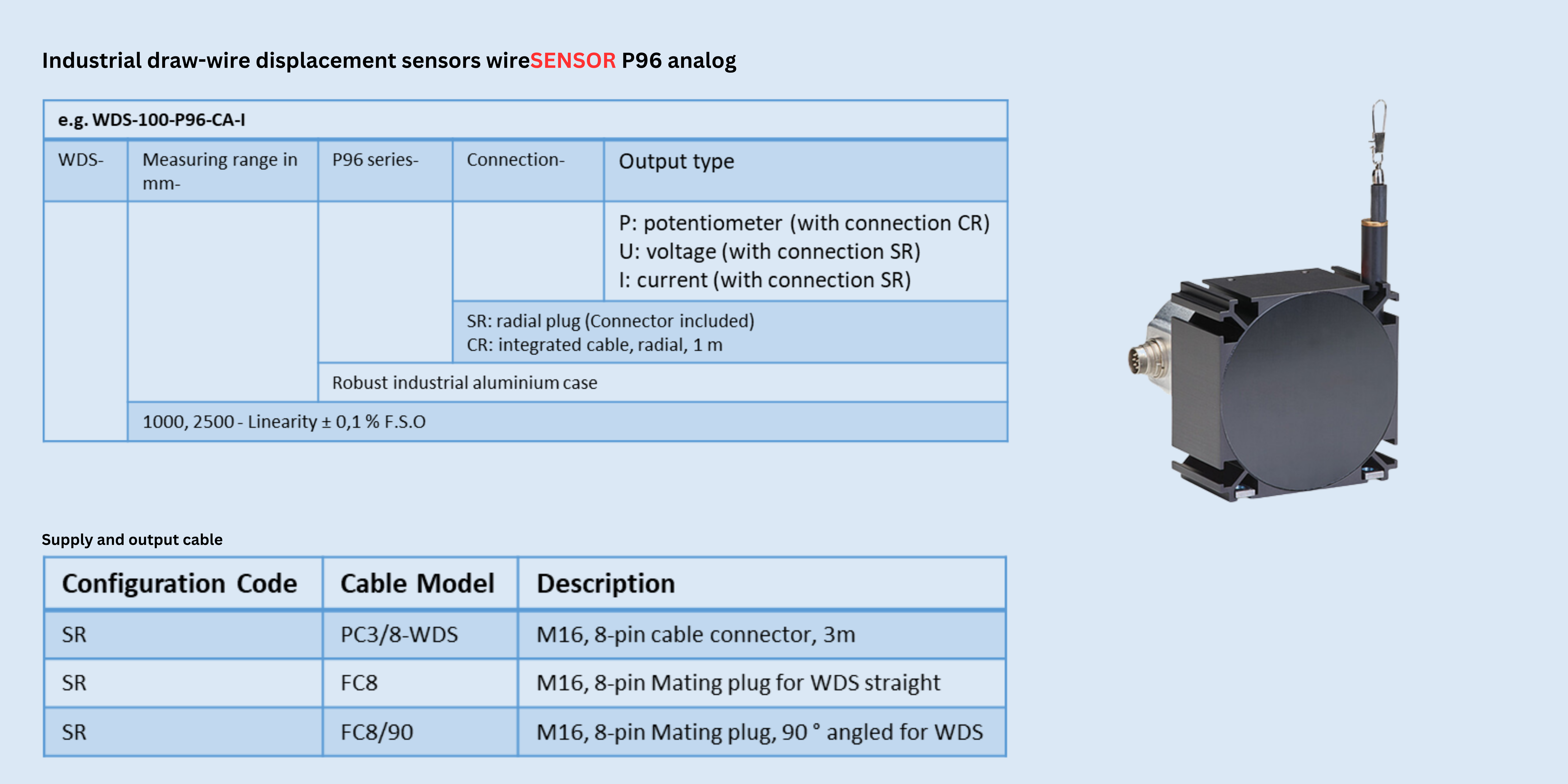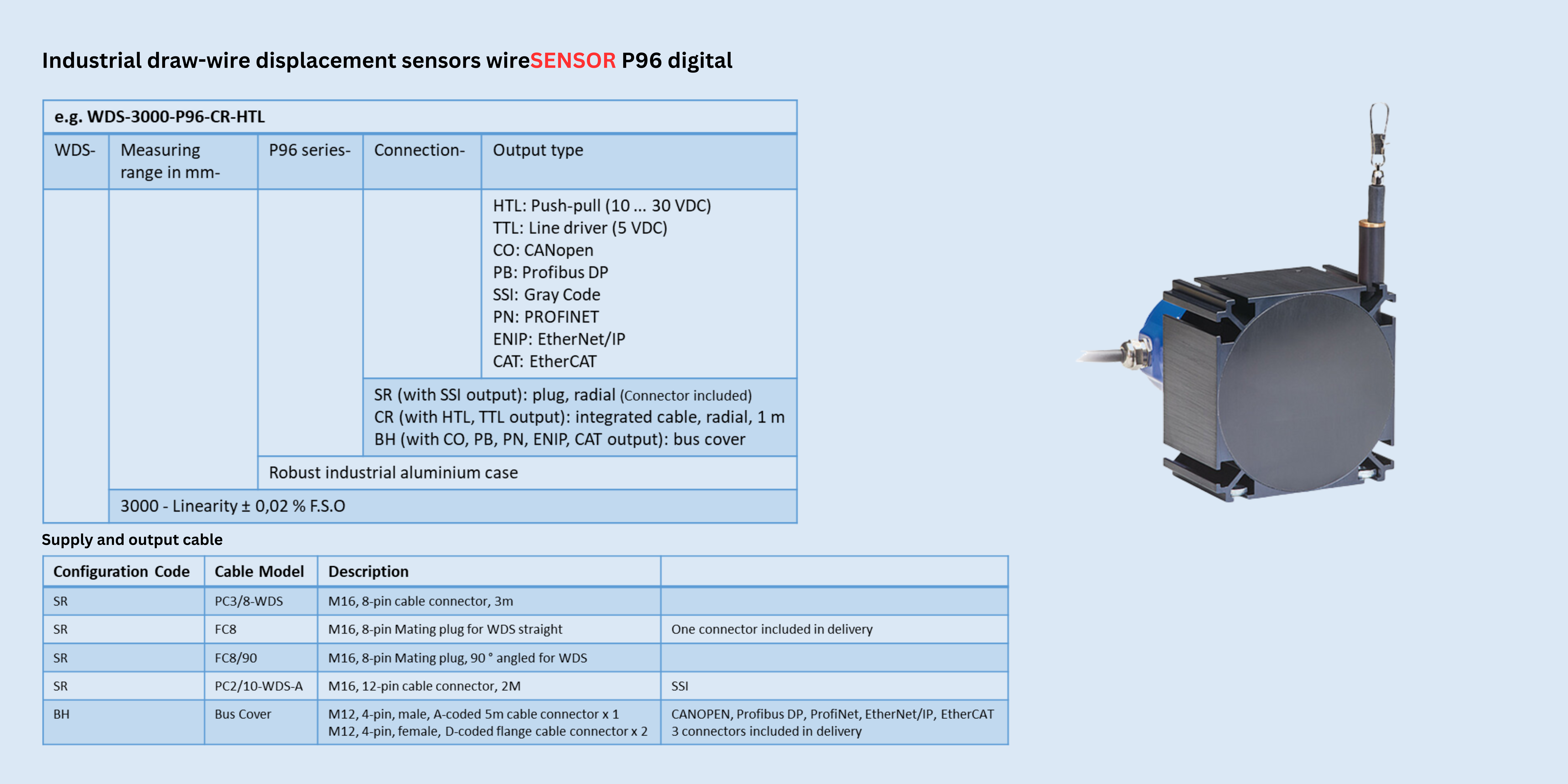 Draw wire sensors of the P96 Series are designed for general use. Numerous options enable a suitable sensor to be selected for almost any application. Various measuring ranges and digital output types facilitate fast integration for many application areas.
