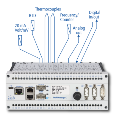 Depending on the I/O module being used, each input can be individually configured for measuring mV, mA, RTDs and thermocouples. Universal inputs for voltage, current and temperature measurement make ProfiMessage D devices extremely flexible. Digital inputs are also available as status or frequency inputs, as well as digital and analog outputs.